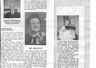 The Oakland Center was forced to move several times, but it continued to remain open on a daily basis with a different minister in charge each evening of the week. This policy allowed Dr. Fitzgerald the time to visit the increasing number of UCM ministers and UCM churches which were beginning to spread throughout the United States. Dr. Fitzgerald also was freed to conduct many special meetings and rallies in the San Francisco Bay Area. Old timers have fond memories of one of the highlights of the Oakland Center’s activities, its annual Fourth of July Picnic, held at a nearby park.